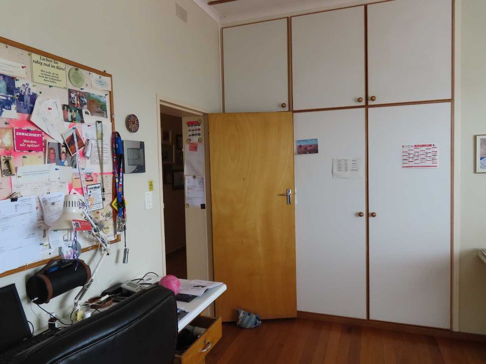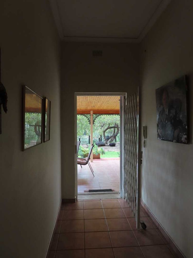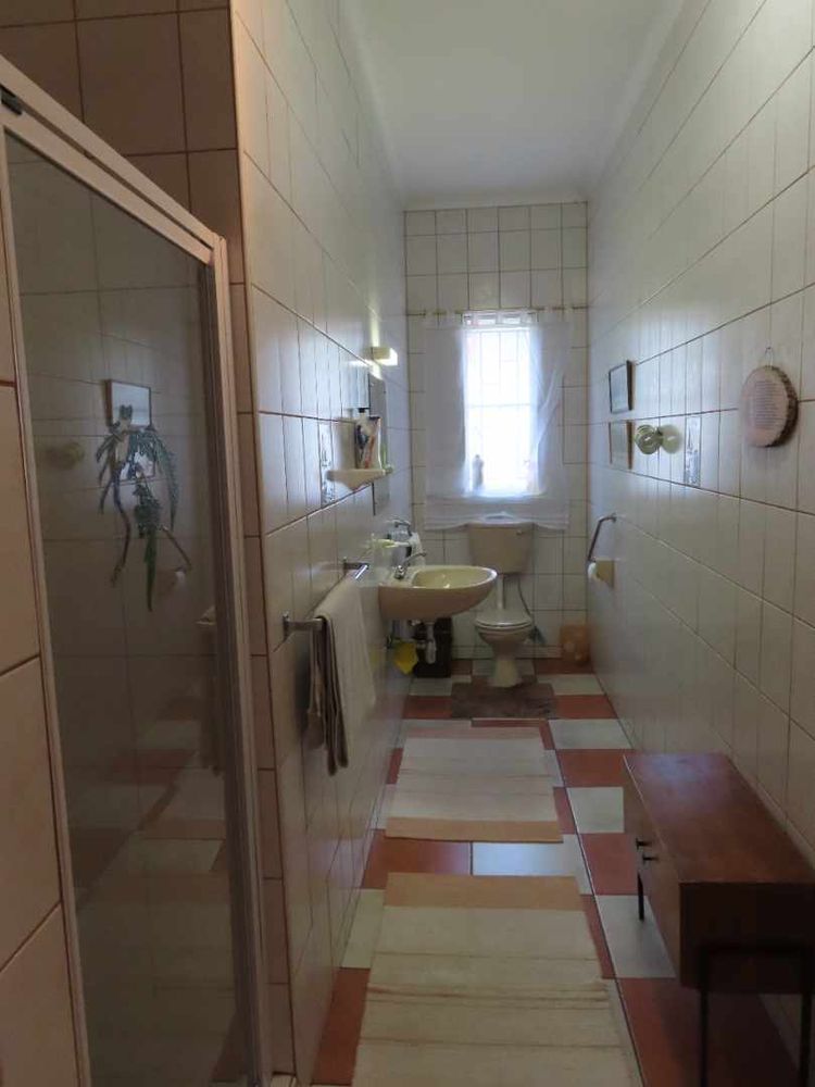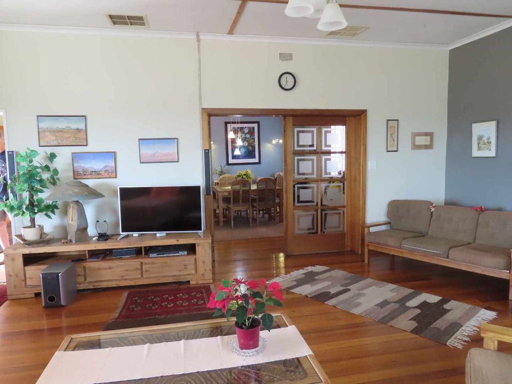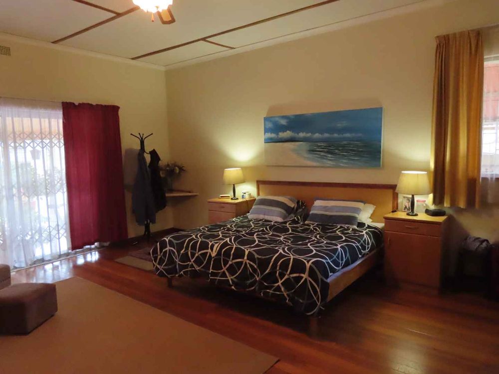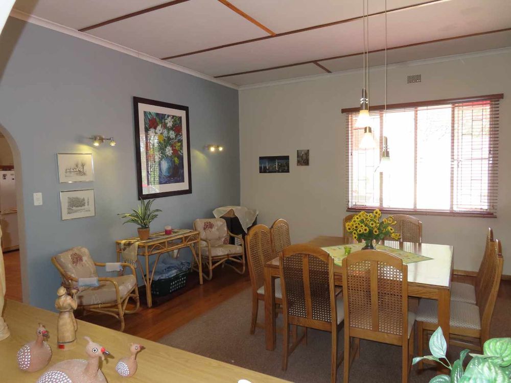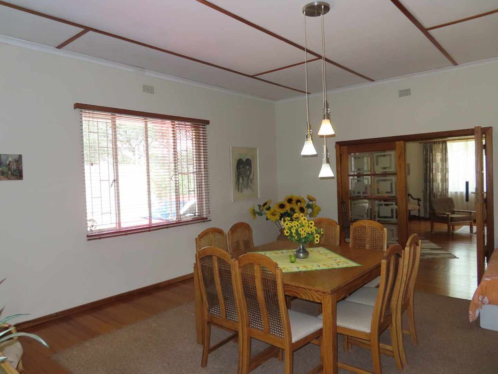 Main house: Cooled by an evaporative cooler, a lounge with fire place, dining room, kitchen with pantry and sculler, three massive bedrooms, 2 bathrooms, 2 verandas, entertainment area with braai and heated pool. There are gorgeous Oregon Pine floors in all rooms except passage and bathrooms. The garden is easy to maintain. A garage for 4 cars and parking for up to eight cars (or more, if need be!)